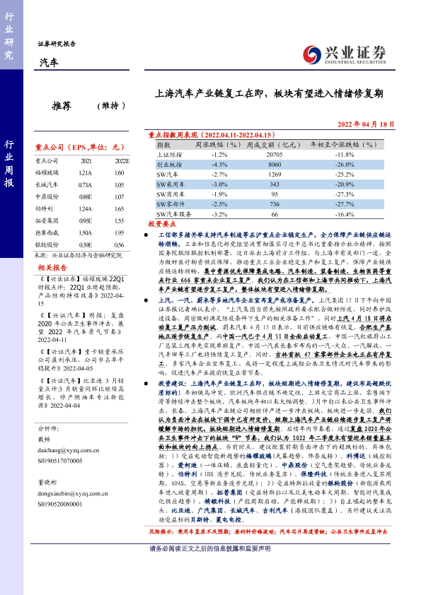 【兴业证券】【20220418】上海汽车产业链复工在即,板块有望进入情绪修复期-26页