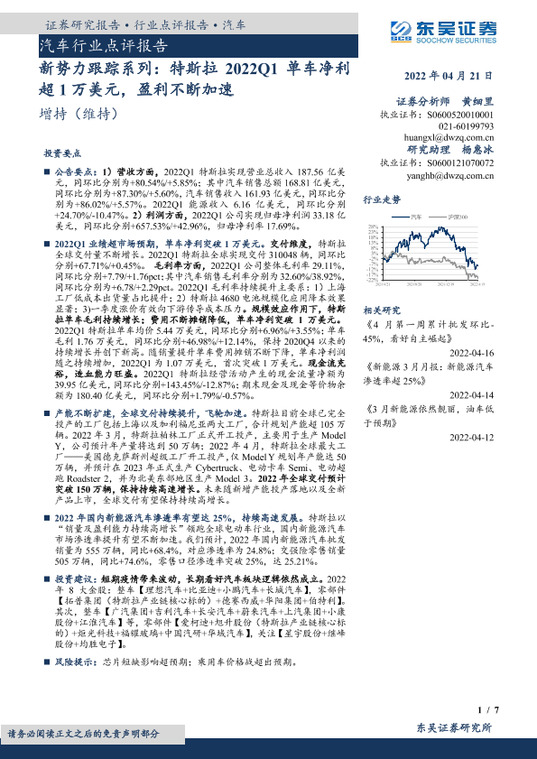 【东吴证券】【20220421】20220421-东吴证券-汽车行业点评报告:新势力跟踪系列:特斯拉2022Q1单车净利超1万美元,盈利不断加速-7页