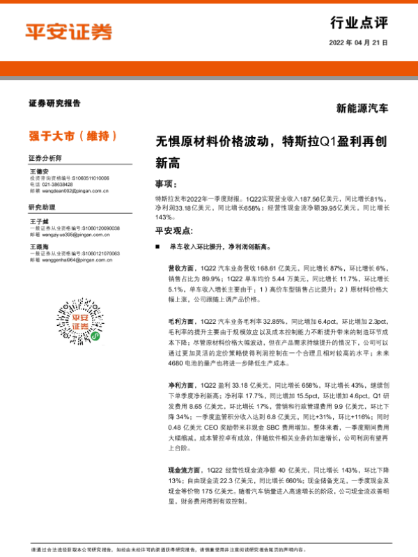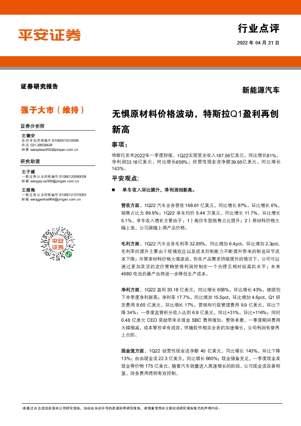 【平安证券】【20220421】新能源汽车:无惧原材料价格波动,特斯拉Q1盈利再创新高-4页