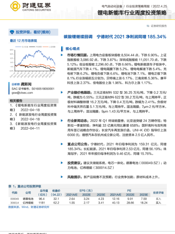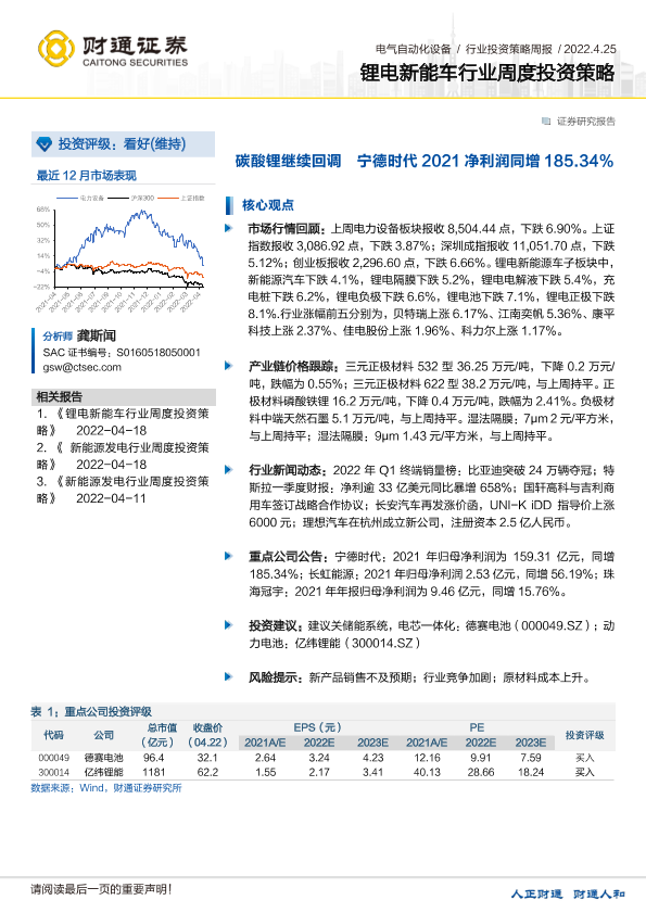 【财通证券】【20220425】锂电新能车行业周度投资策略:碳酸锂继续回调 宁德时代2021净利润同增185.34%-18页