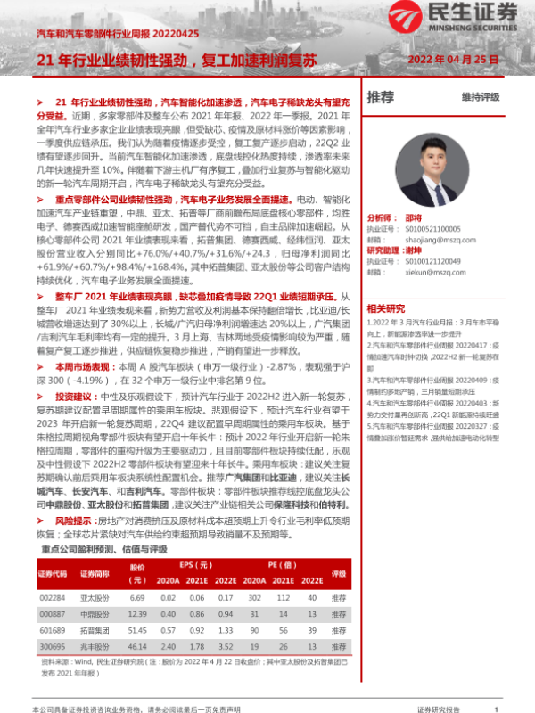【民生证券】【20220425】汽车和汽车零部件行业周报:21年行业业绩韧性强劲,复工加速利润复苏-24页
