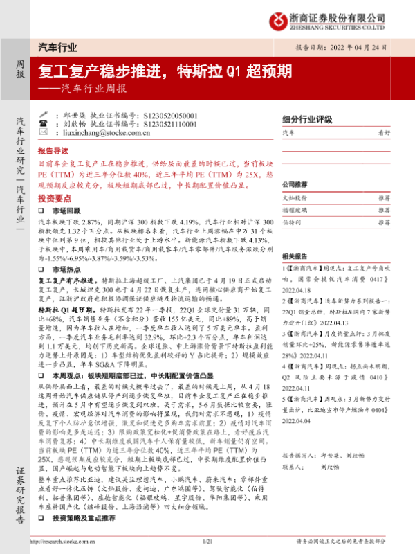 【浙商证券】【20220424】20220424-浙商证券-汽车行业周报:复工复产稳步推进,特斯拉Q1超预期-21页