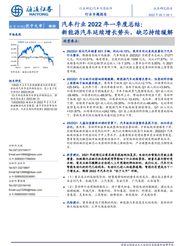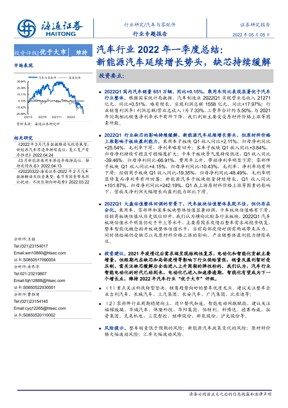 【海通证券】【20220505】汽车行业2022年一季度总结:新能源汽车延续增长势头,缺芯持续缓解-22页