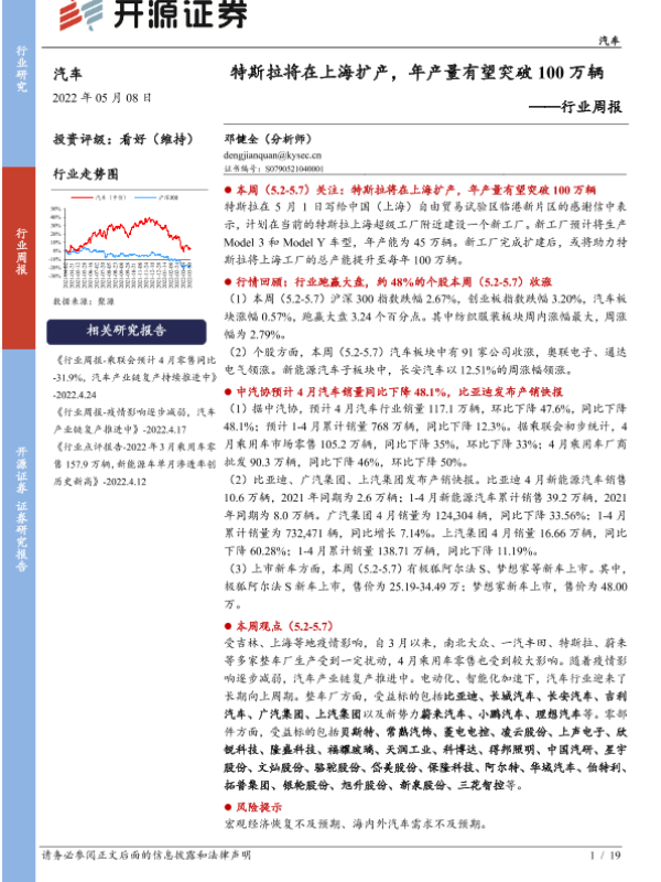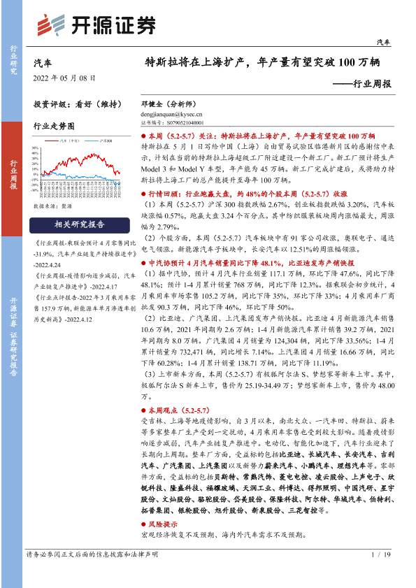 【开源证券】【20220508】20220508-开源证券-汽车行业周报:特斯拉将在上海扩产,年产量有望突破100万辆-19页