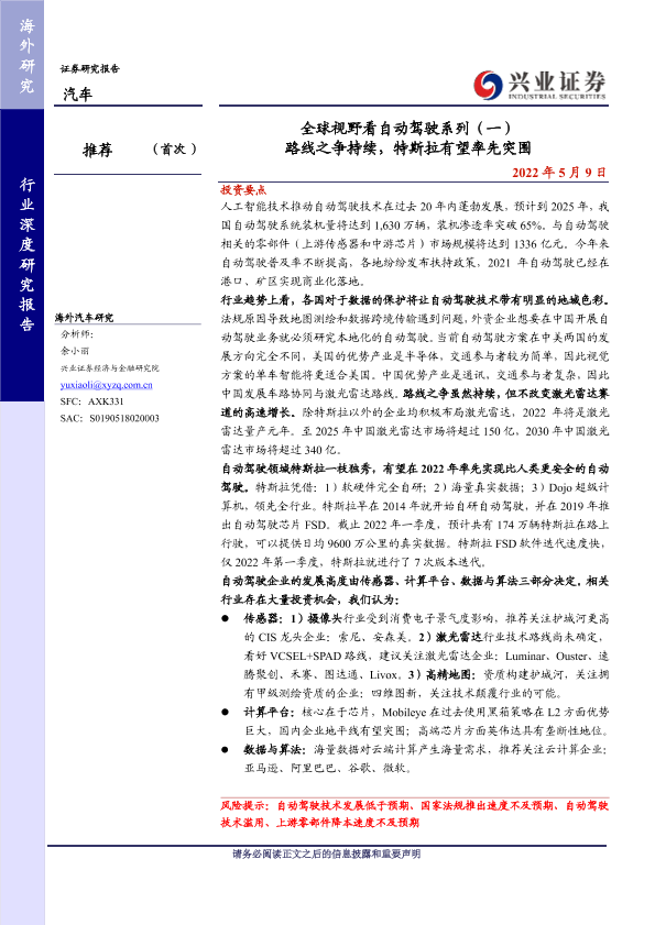 【兴业证券】【20220509】全球视野看自动驾驶系列(一):路线之争持续,特斯拉有望率先突围-45页