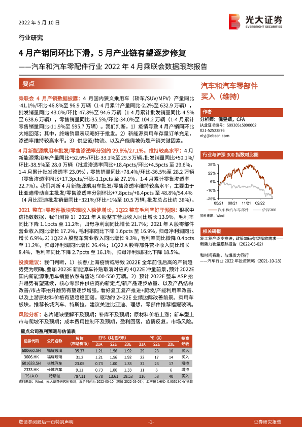 【光大证券】【20220510】汽车和汽车零配件行业2022年4月乘联会数据跟踪报告:4月产销同环比下滑,5月产业链有望逐步修复-3页
