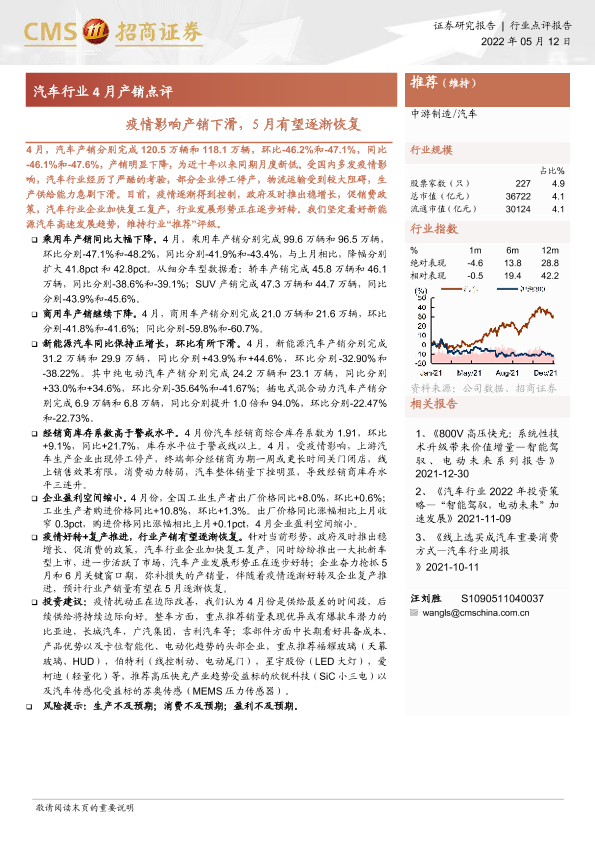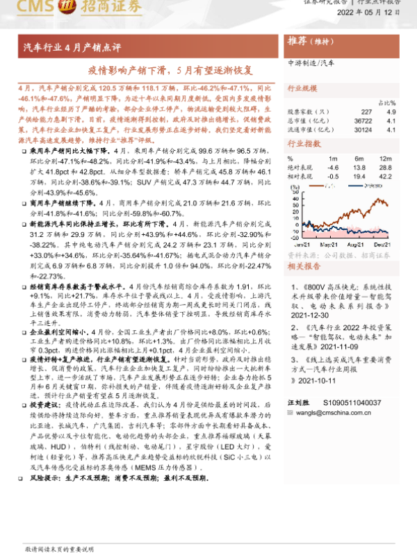【海通证券】【20220512】汽车行业4月产销点评:疫情影响产销下滑,5月有望逐渐恢复-5页