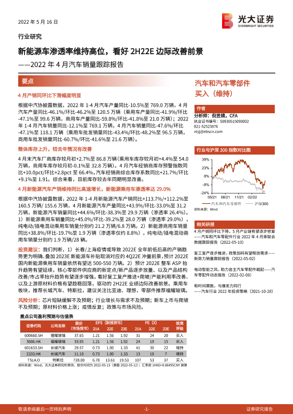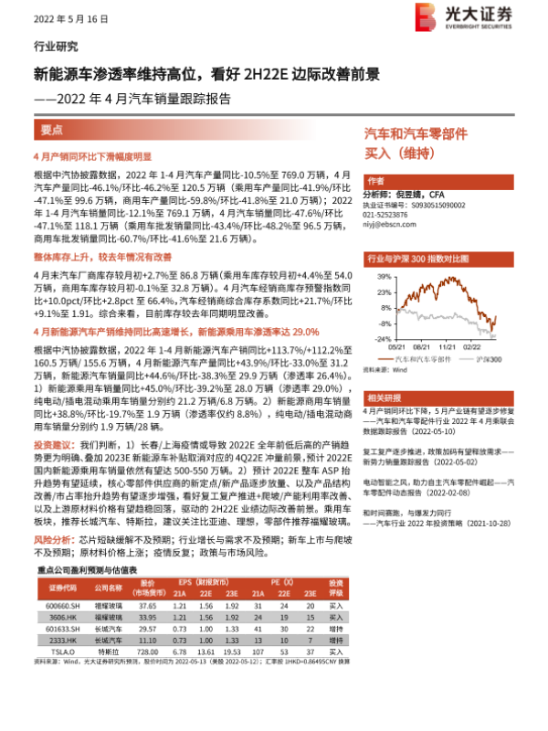 【光大证券】【20220516】汽车和汽车零部件2022年4月汽车销量跟踪报告:新能源车渗透率维持高位,看好2H22E边际改善前景-15页