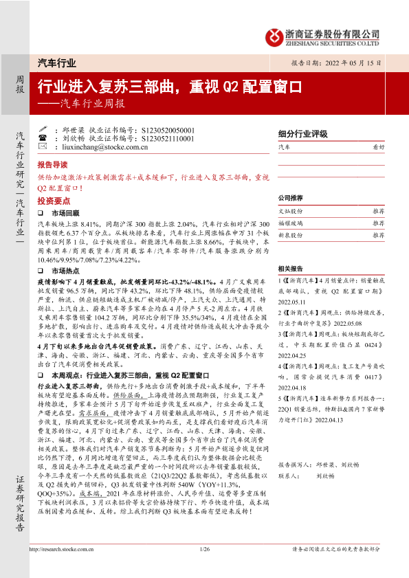 【浙商证券】【20220515】20220515-浙商证券-汽车行业周报:行业进入复苏三部曲,重视Q2配置窗口-26页
