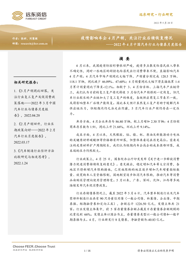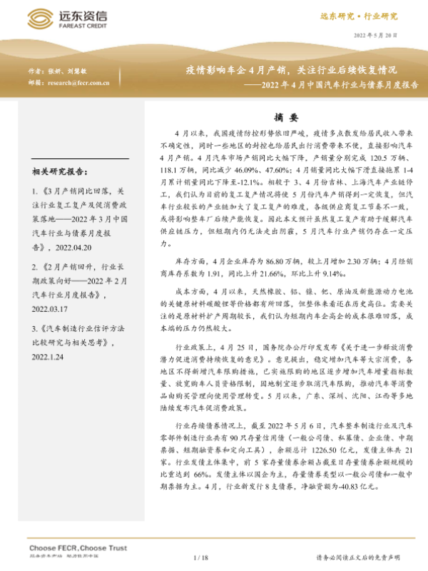 【远东资信】【20220520】2022年4月中国汽车行业与债券月度报告:疫情影响车企4月产销,关注行业后续恢复情况-18页