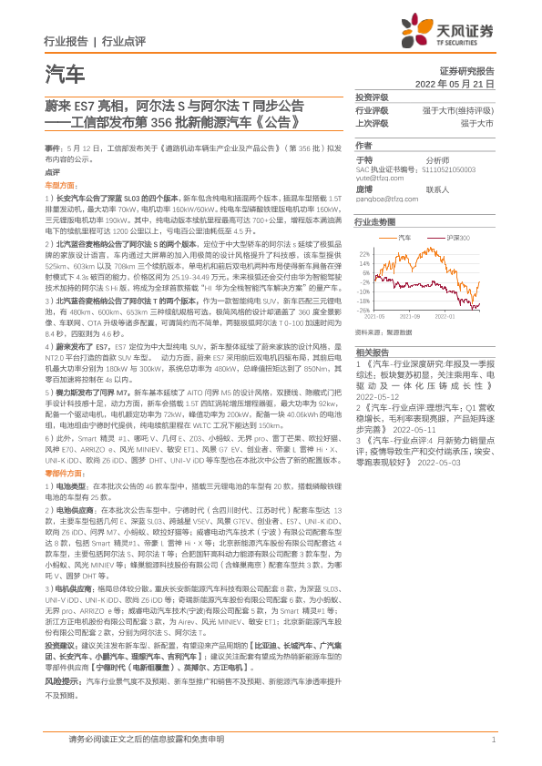 【天风证券】【20220521】汽车:工信部发布第356批新能源汽车《公告》-蔚来ES7亮相,阿尔法S与阿尔法T同步公告-7页