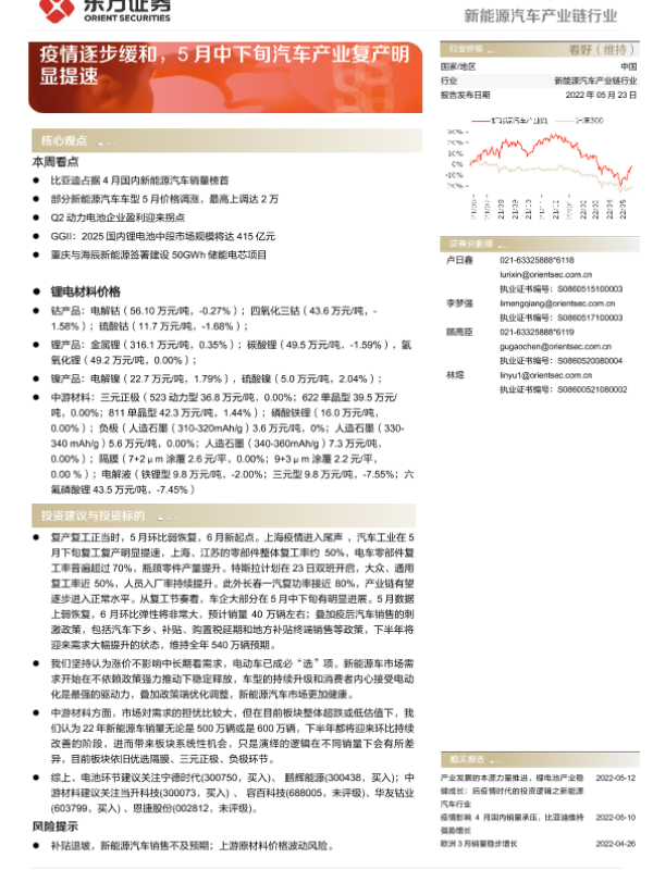 【东方证券】【20220523】20220523-东方证券-新能源汽车产业链行业周报:疫情逐步缓和,5月中下旬汽车产业复产明显提速-14页