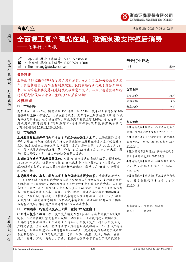【浙商证券】【20220522】20220522-浙商证券-汽车行业周报:全面复工复产曙光在望,政策刺激支撑疫后消费-31页
