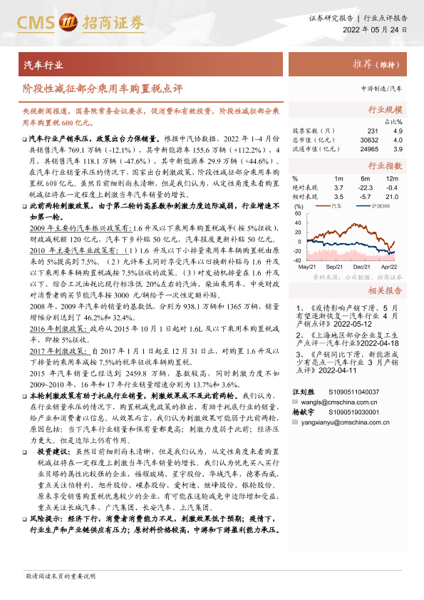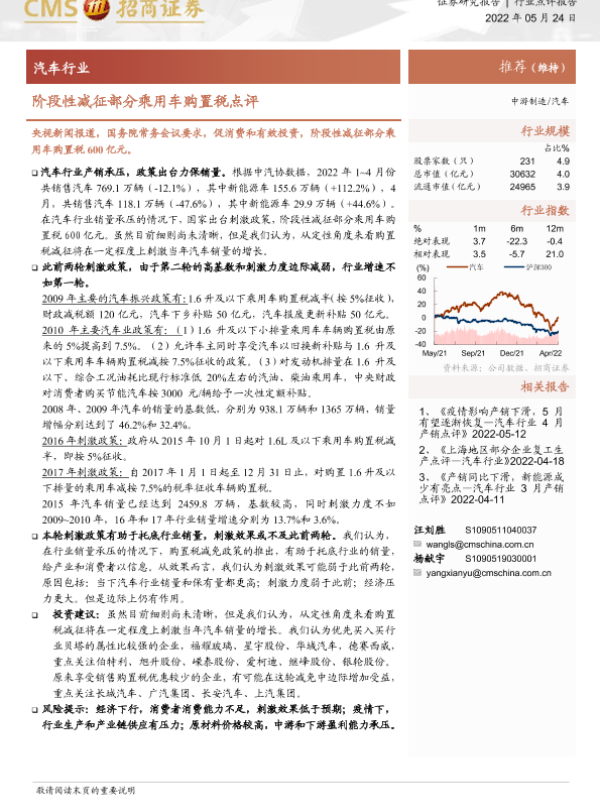 【海通证券】【20220524】汽车行业:阶段性减征部分乘用车购置税点评-3页
