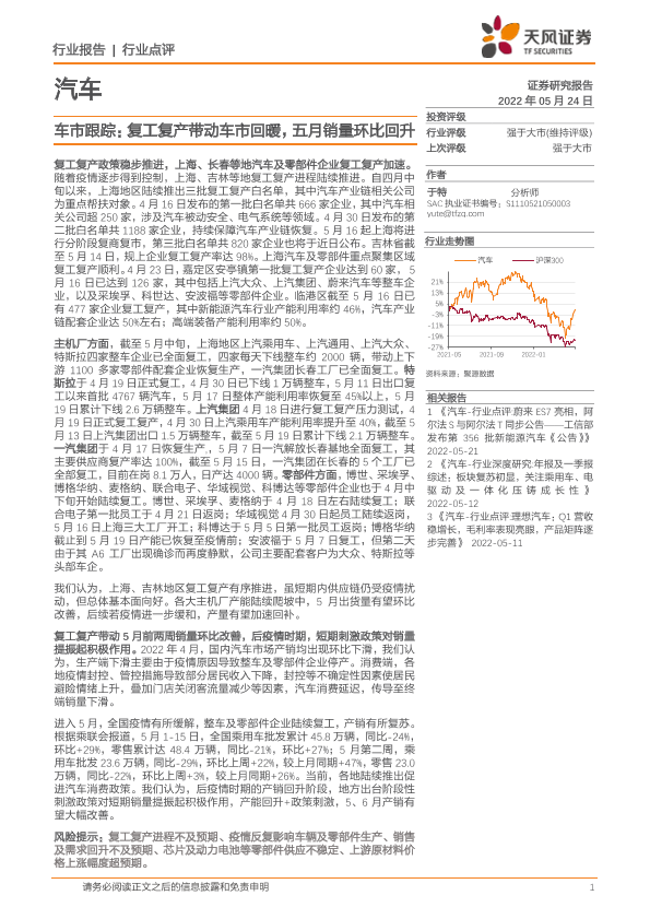 【天风证券】【20220524】车市跟踪:复工复产带动车市回暖,五月销量环比回升-4页