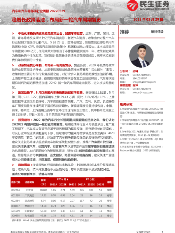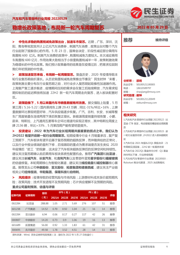 【民生证券】【20220529】汽车和汽车零部件行业周报:稳增长政策落地,布局新一轮汽车周期复苏-26页