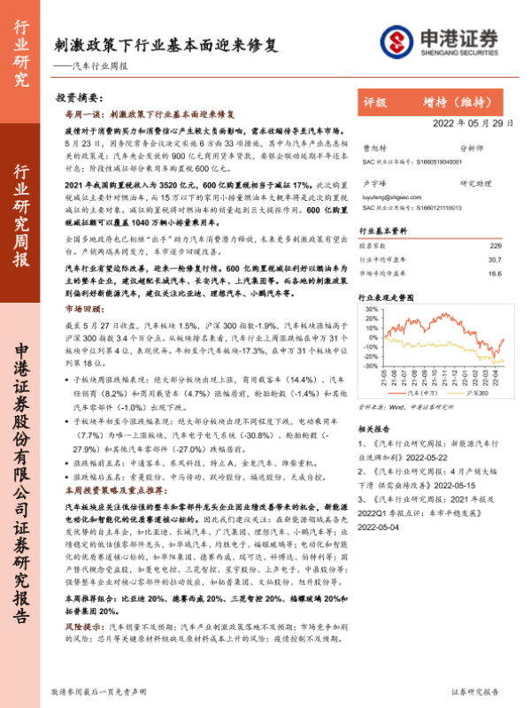 【申港证券】【20220529】刺激政策下行业基本面迎来修复——汽车行业周报-16页
