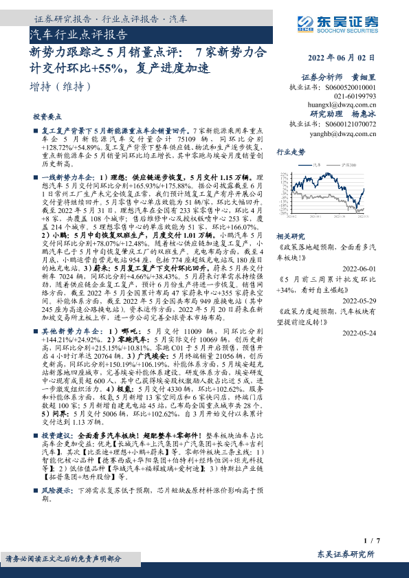 【东吴证券】【20220602】新势力跟踪之5月销量点评:7家新势力合计交付环比+55%,复产进度加速-7页