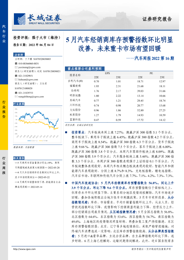 【长城证券】【20220604】汽车周报2022第16期:5月汽车经销商库存预警指数环比明显改善,未来重卡市场有望回暖-12页