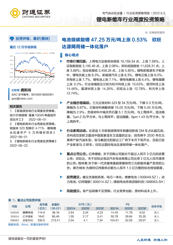 【财通证券】【20220605】20220605-财通证券-锂电新能车行业周度投资策略:电池级碳酸锂47.25万元 吨上涨0.53% 欣旺达源网荷储一体化落户-19页
