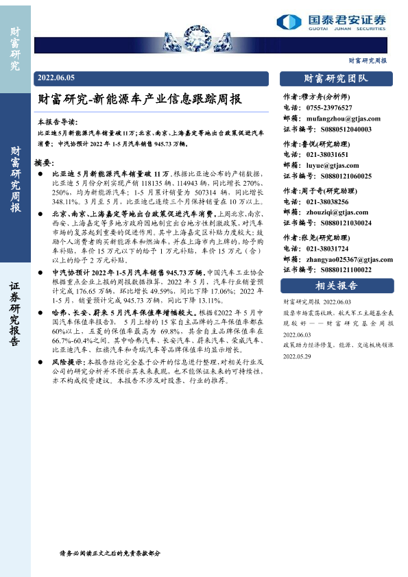 【国泰君安证券】【20220605】财富研究-新能源车产业信息跟踪周报-6页