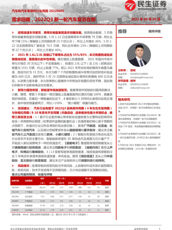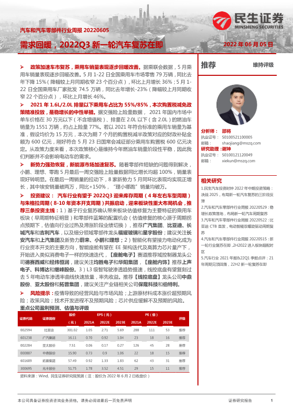 【民生证券】【20220605】汽车和汽车零部件行业周报:需求回暖,2022Q3新一轮汽车复苏在即-24页