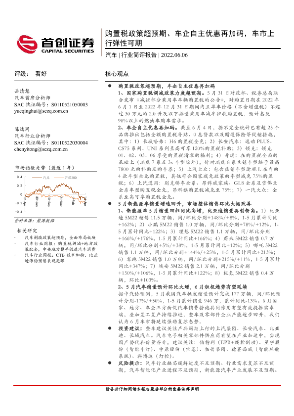 【首创证券】【20220606】20220606-首创证券-汽车行业简评报告:购置税政策超预期、车企自主优惠再加码,车市上行弹性可期-13页