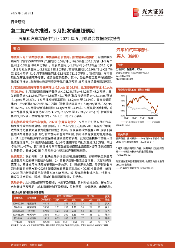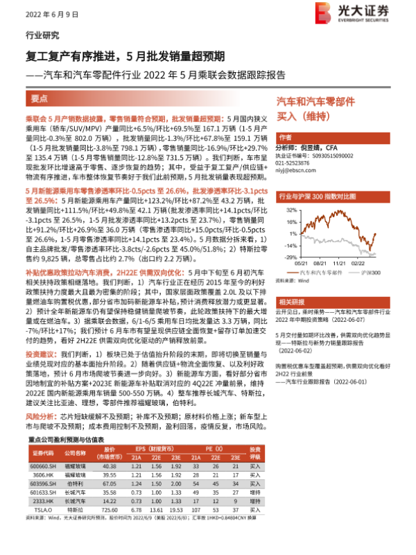 【光大证券】【20220609】汽车和汽车零配件行业2022年5月乘联会数据跟踪报告:复工复产有序推进,5月批发销量超预期-3页