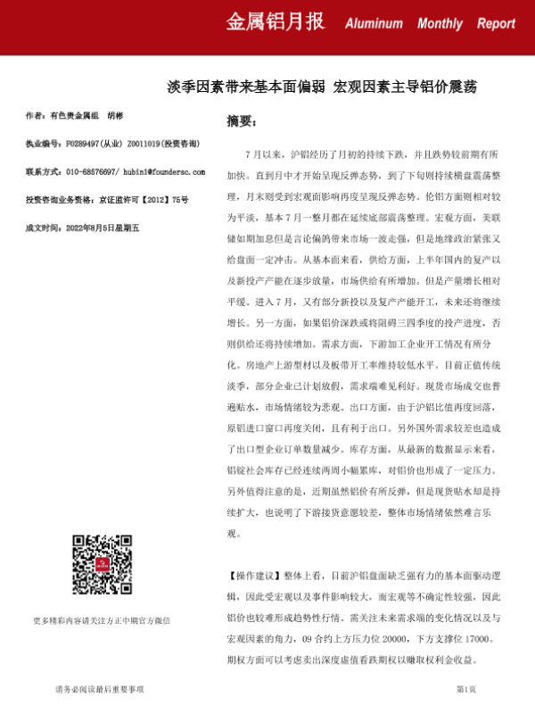 【方正中期期货】【20220805】金属铝月报:淡季因素带来基本面偏弱,宏观因素主导铝价震荡-25页