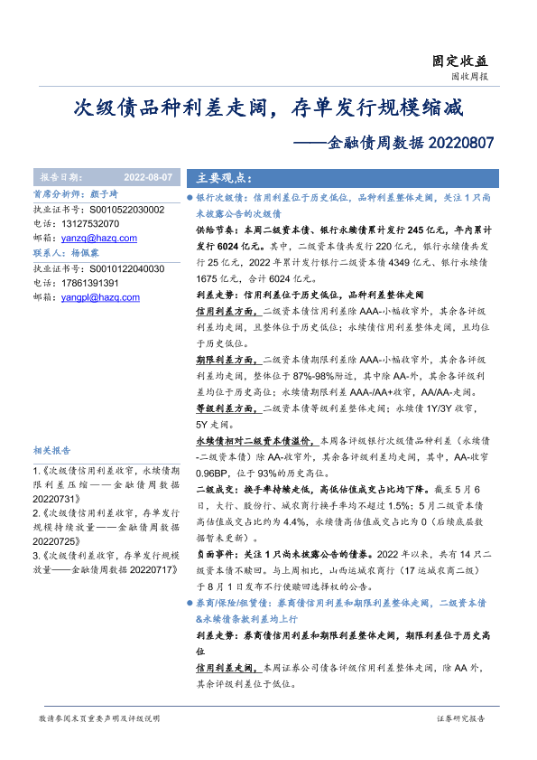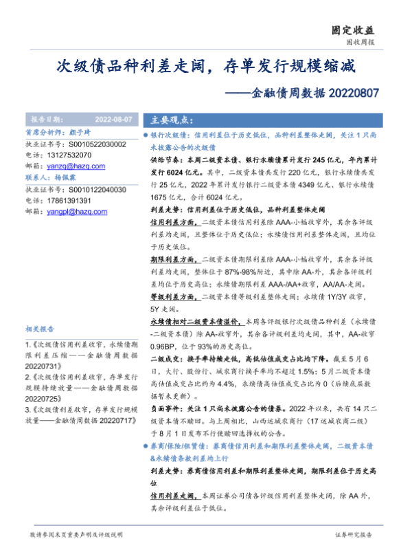 【华安证券】【20220807】金融债周数据:次级债品种利差走阔,存单发行规模缩减-20页