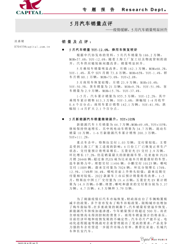 【群益证券】【20220616】5月汽车销量点评:疫情缓解,5月汽车销量明显回升-2页