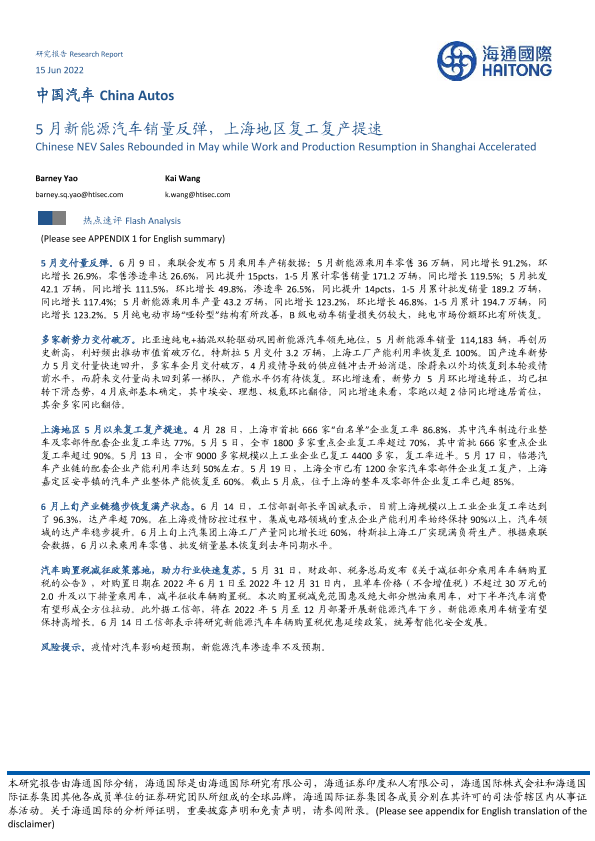 【海通国际】【20220615】中国汽车:5月新能源汽车销量反弹,上海地区复工复产提速-19页