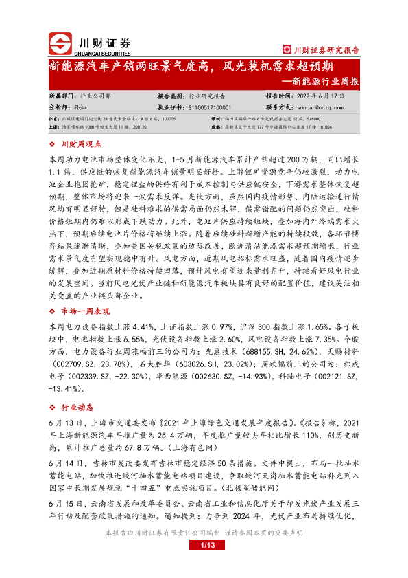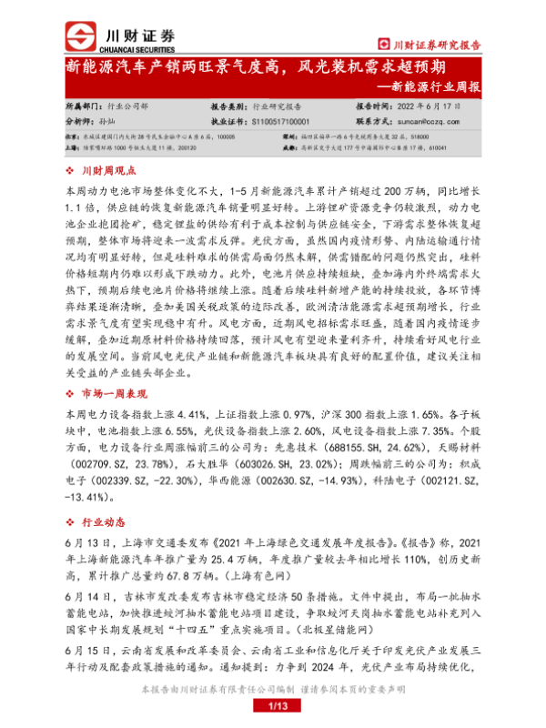 【川财证券】【20220617】20220617-川财证券-新能源行业周报:新能源汽车产销两旺景气度高,风光装机需求超预期-13页