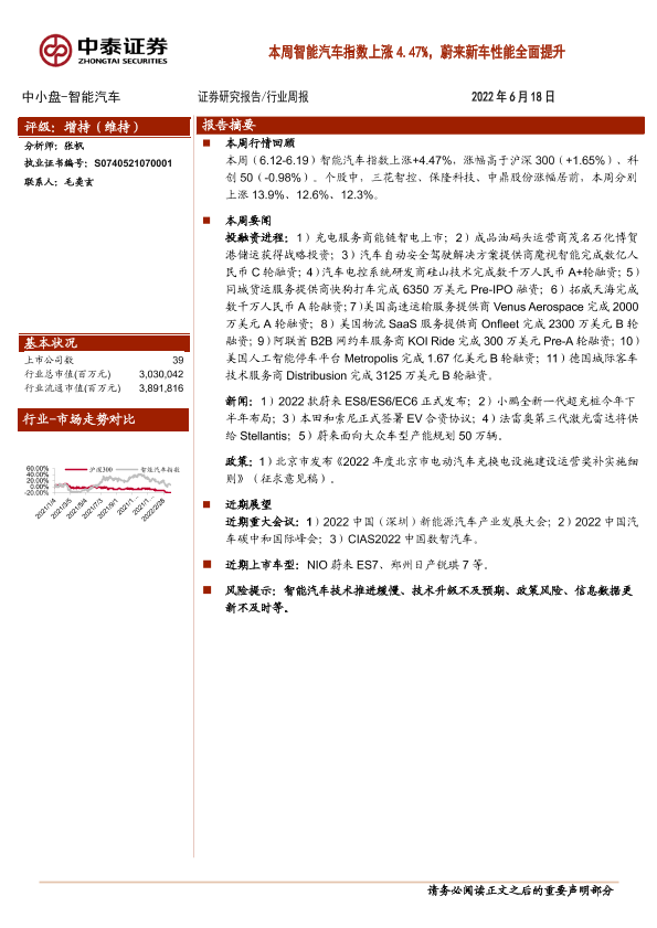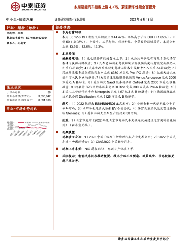 【中泰证券】【20220618】20220618-中泰证券-中小盘-智能汽车行业周报:本周智能汽车指数上涨4.47%,蔚来新车性能全面提升-8页