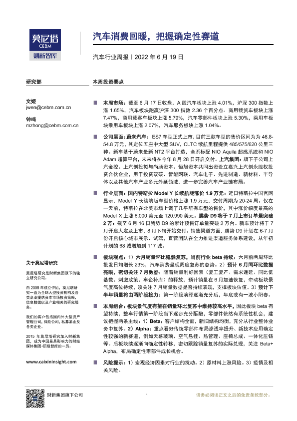 【莫尼塔研究】【20220619】汽车行业周报:汽车消费回暖,把握确定性赛道-16页