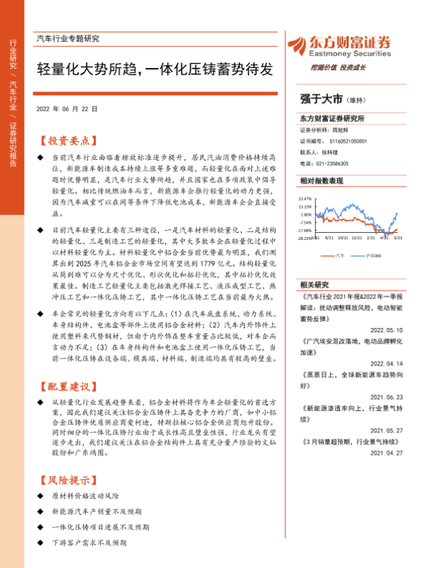 【东方财富证券】【20220622】汽车行业专题研究:轻量化大势所趋,一体化压铸蓄势待发-26页