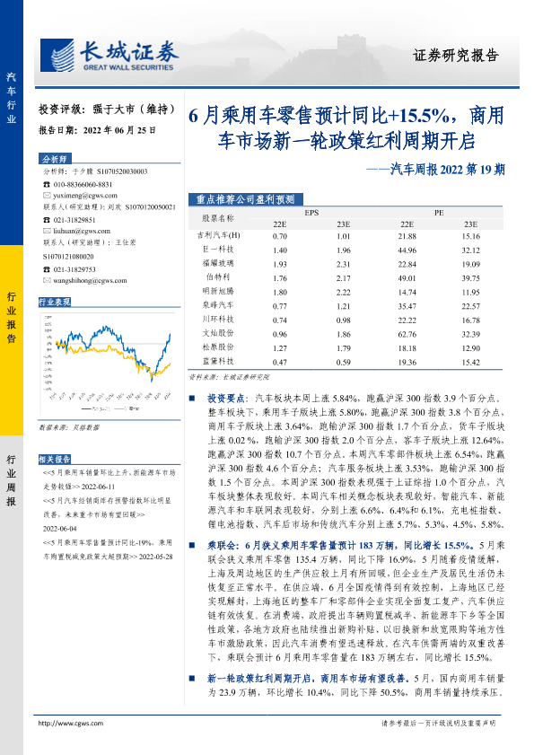 【长城证券】【20220625】汽车周报2022第19期:6月乘用车零售预计同比+15.5%,商用车市场新一轮政策红利周期开启-12页