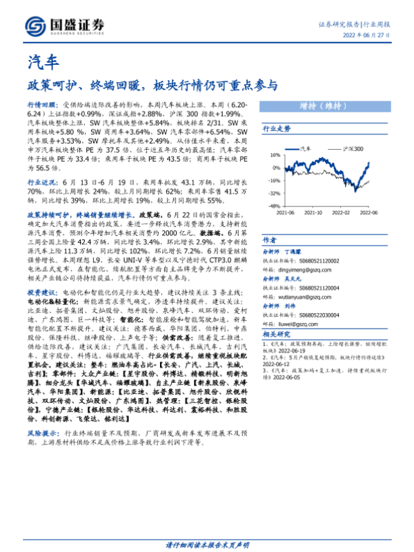 【国盛证券】【20220627】20220627-国盛证券-汽车行业周报:政策呵护、终端回暖,板块行情仍可重点参与-22页