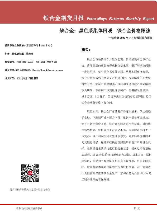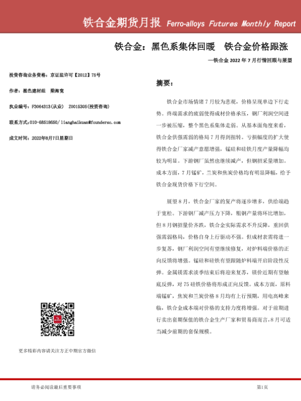 【方正中期期货】【20220807】铁合金期货月报-20220807-26页