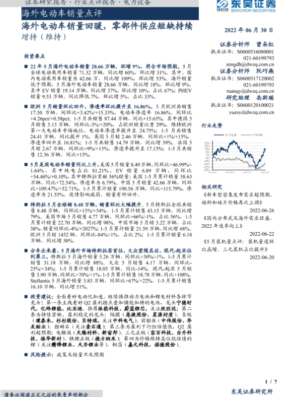【东吴证券】【20220630】海外电动车销量点评:海外电动车销量回暖,零部件供应短缺持续-7页