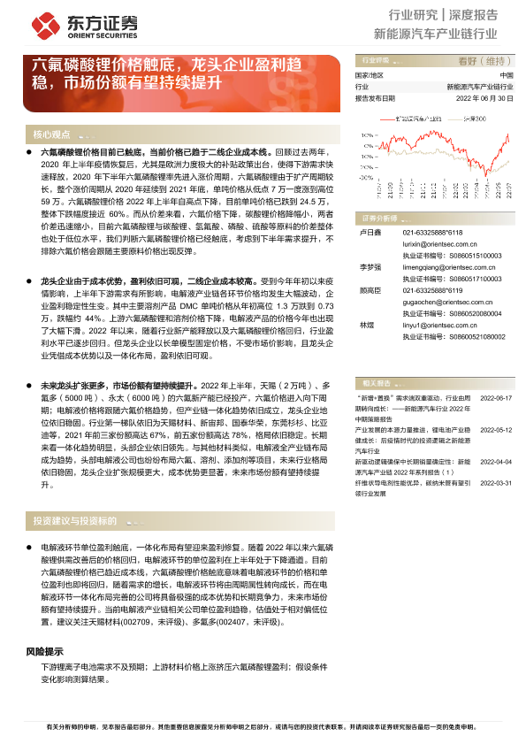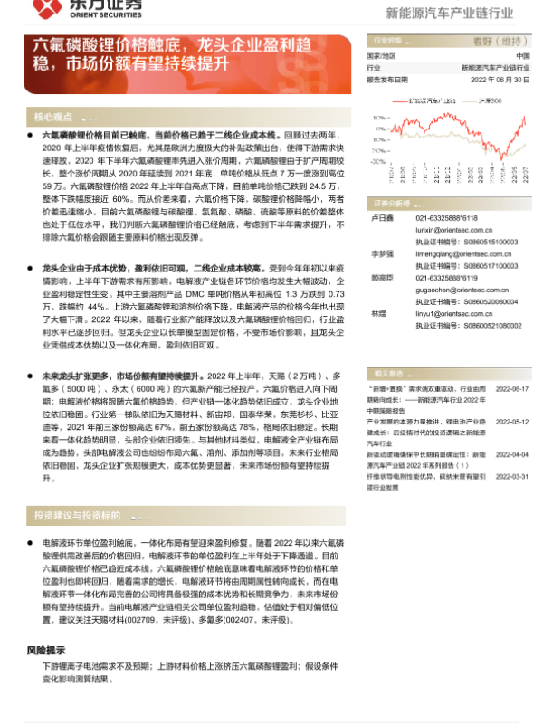 【东方证券】【20220630】20220630-东方证券-新能源汽车产业链行业深度报告:六氟磷酸锂价格触底,龙头企业盈利趋稳,市场份额有望持续提升-15页