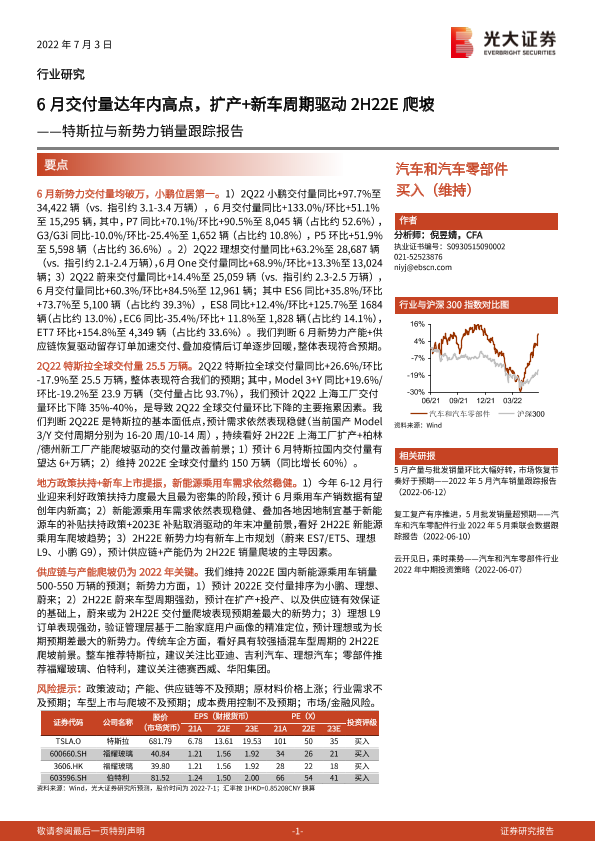 【光大证券】【20220703】20220703-光大证券-特斯拉与新势力销量跟踪报告:6月交付量达年内高点,扩产+新车周期驱动2H22E爬坡-4页