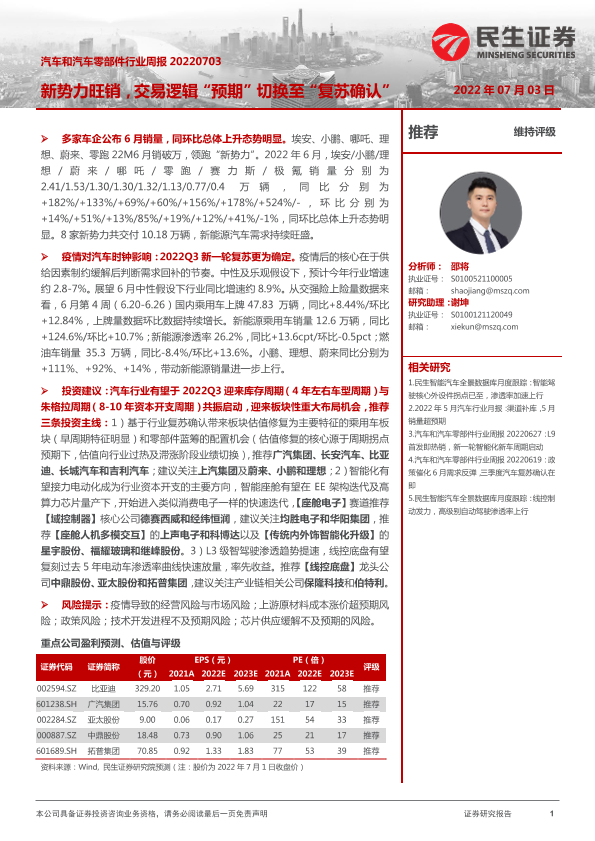 【民生证券】【20220703】汽车和汽车零部件行业周报:新势力旺销,交易逻辑“预期”切换至“复苏确认”-27页