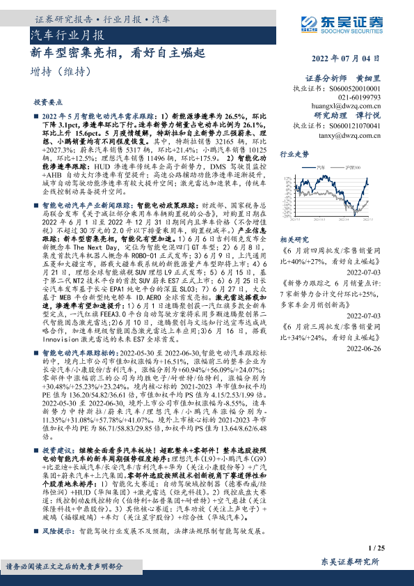 【东吴证券】【20220704】20220704-东吴证券-汽车行业月报:新车型密集亮相,看好自主崛起-25页