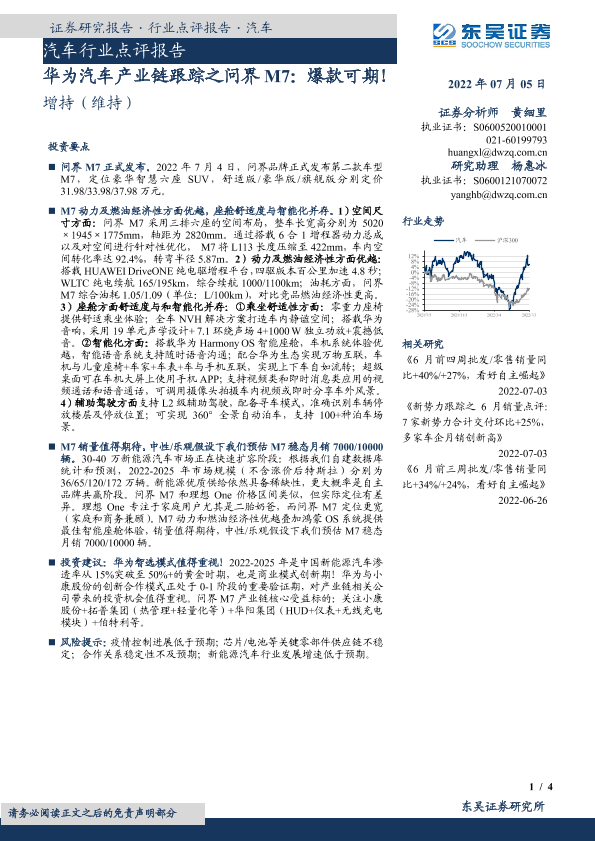 【东吴证券】【20220705】汽车行业点评报告:华为汽车产业链跟踪之问界M7:爆款可期!-4页