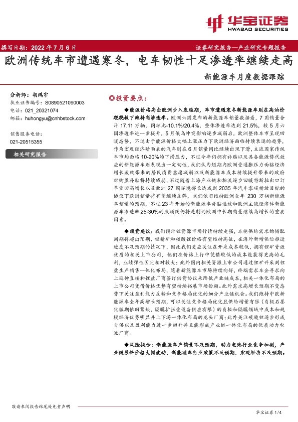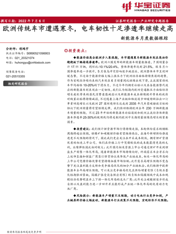 【华宝证券】【20220706】20220706-华宝证券-新能源车月度数据跟踪:欧洲传统车市遭遇寒冬,电车韧性十足渗透率继续走高-4页