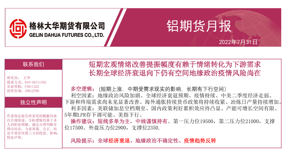 【格林大华期货】【20220731】铝期货月报:短期宏观情绪改善提振幅度有赖于情绪转化为下游需求,长期全球经济衰退向下仍有空间地缘政治疫情风险尚在-26页