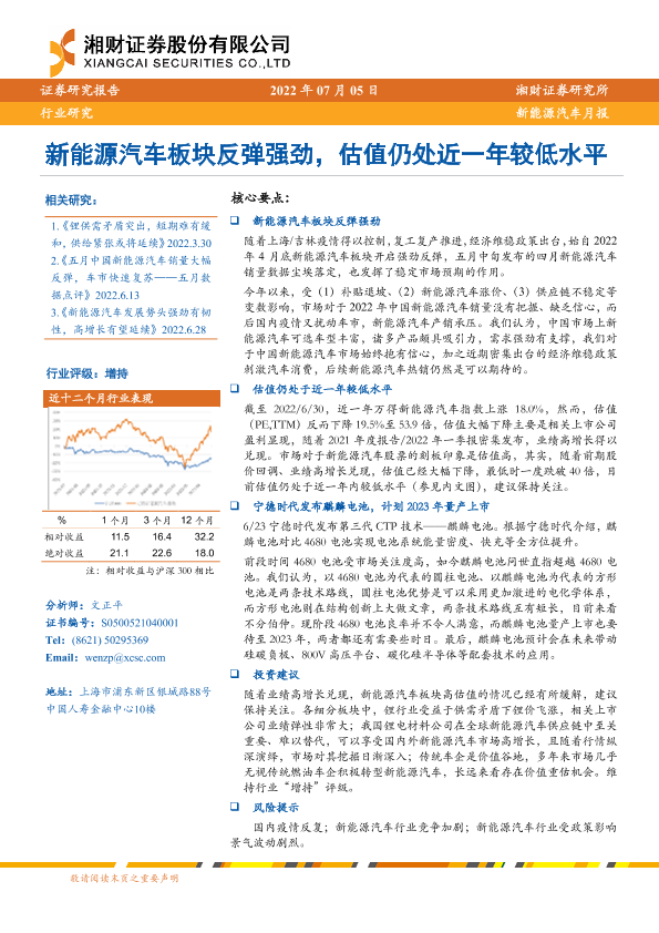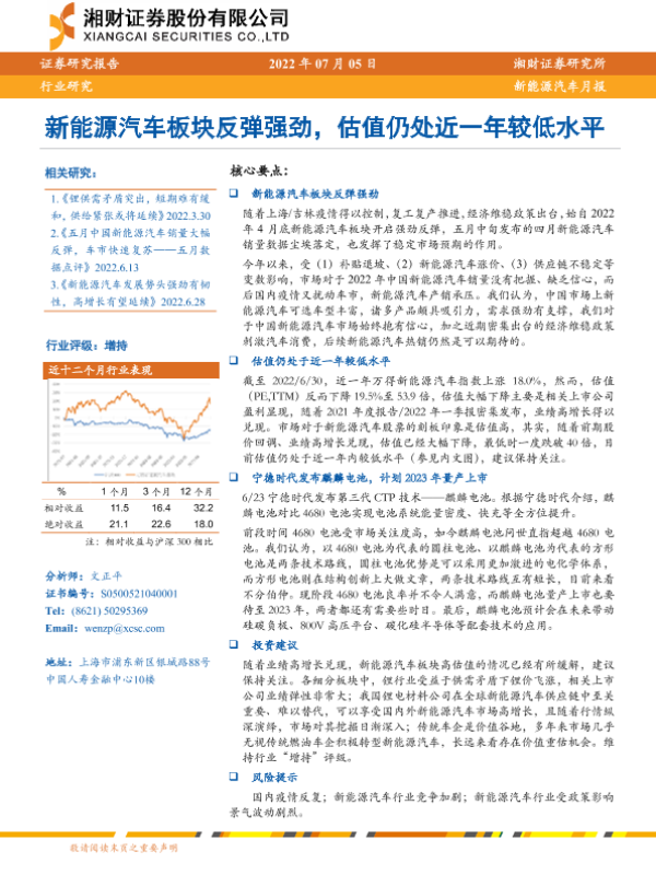 【湘财证券】【20220705】20220705-湘财证券-新能源汽车月报:新能源汽车板块反弹强劲,估值仍处近一年较低水平-13页