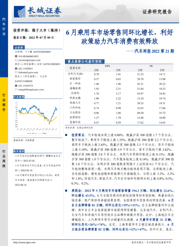 【长城证券】【20220709】汽车周报2022第21期:6月乘用车市场零售同环比增长,利好政策助力汽车消费有效释放-13页