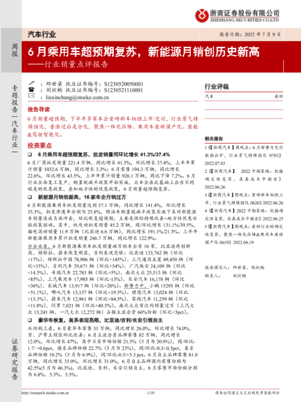 【浙商证券】【20220709】汽车行业销量点评报告:6月乘用车超预期复苏,新能源月销创历史新高-10页